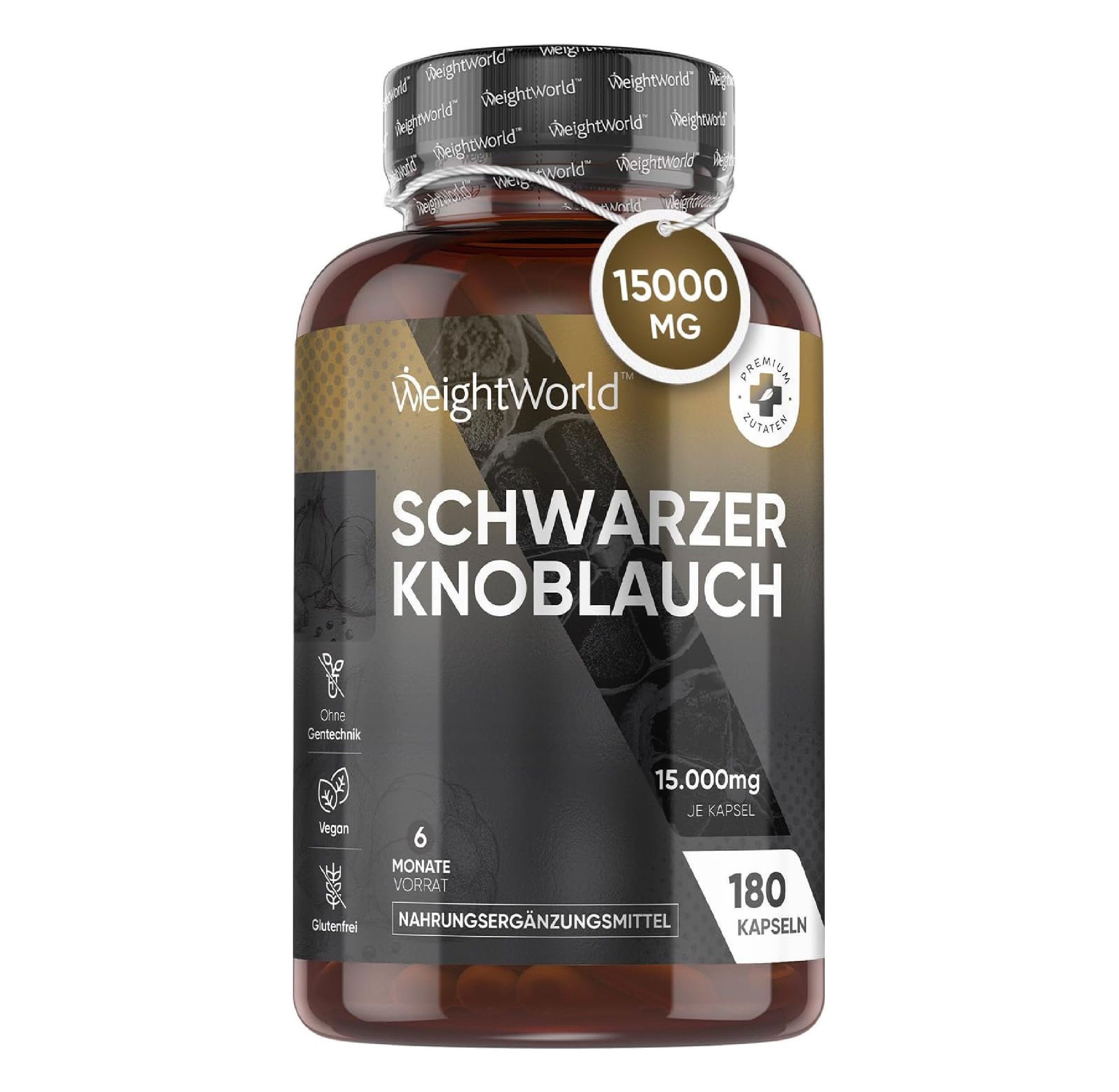 Le capsule di aglio nero WeightWorld apportano 15.000 mg di aglio in polvere per capsula e contengono estratto di aglio nero 100:1 (Allium sativum), pari a 150 mg. Il prodotto contiene 180 capsule vegane, sufficienti per una fornitura di 6 mesi.