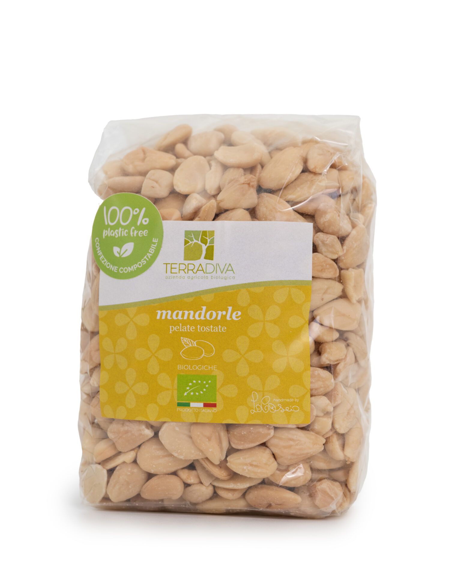 mandorle bilogiche pelate e tostate, croccanti, selezionate e confezionate a mano.