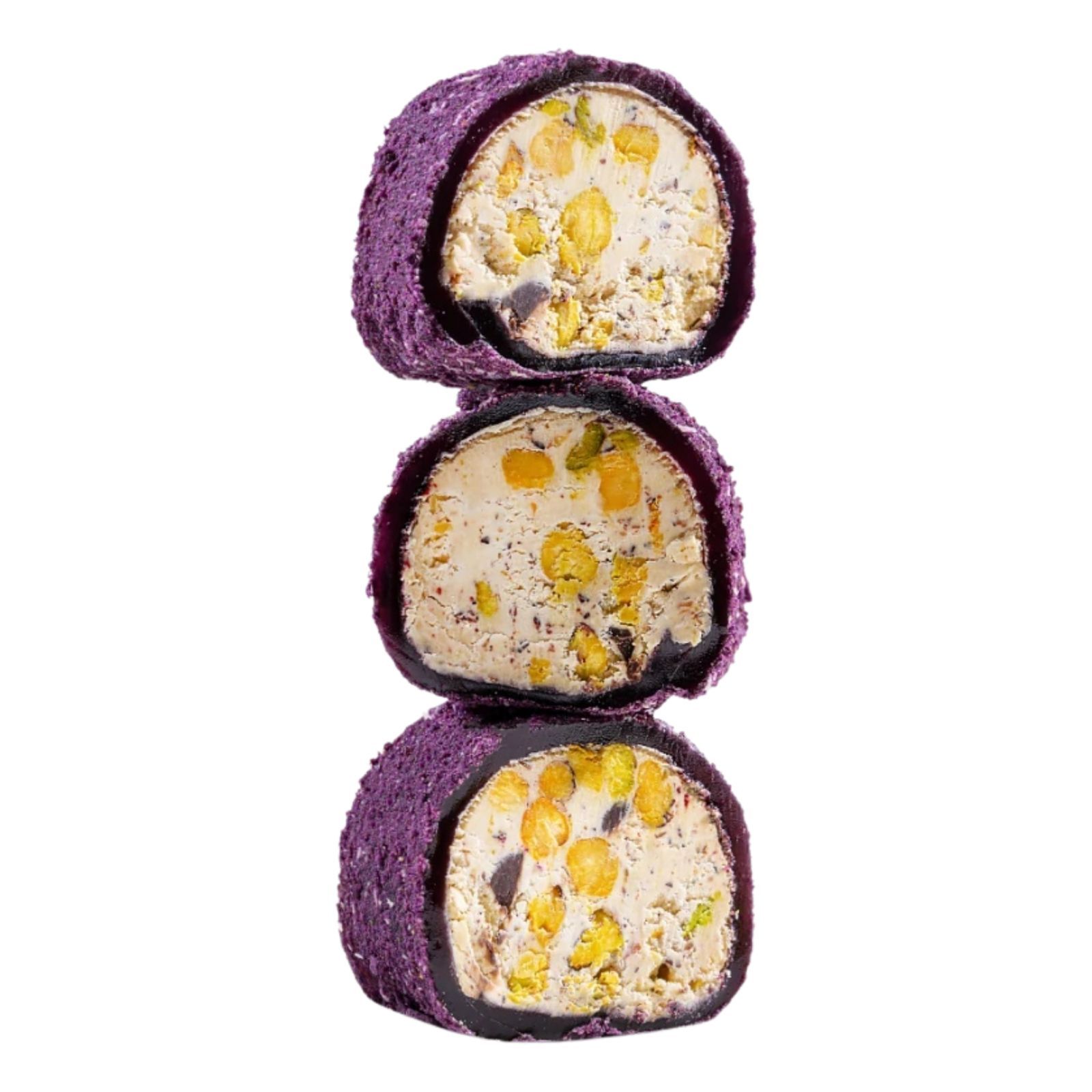 Pistacchi (12%), Cocco, Torta di Velluto Viola (Zucchero, Farina di frumento, Latte in polvere, Amido di frumento, Emulsionanti, Agenti lievitanti, Spirulina blu, Colorante naturale (Barbabietola Rossa), Sale, Aroma (Frutta), Zucchero, Amido di mais, Acqua, Addensanti, Regolatore di acidità), Ripieno di Gelso Nero, Estratto di Erbe Çöğen, Aroma (Vaniglia), Regolatore di acidità (Acido citrico E330).