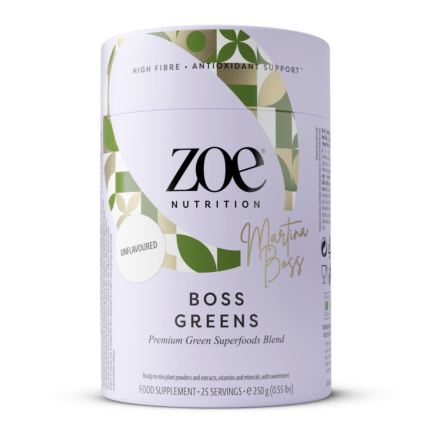 Ingredienti: Miscela di polveri verdi [Spinaci (Spinacia oleracea, foglia), Broccoli (Brassica oleracea var. Italica, bocciolo), Spirulina (Arthrospira platensis, alga intera), Erba d'orzo (Hordeum vulgare, verde), Erba di grano (Triticum aestivum, verde), Cavolo riccio (Brassica oleracea var. sabellica, foglia)], Inulina da fibre di cicoria (Cichorium intybus, radice), Acai (Euterpe oleracea, frutto), Acerola (Malphigia glabra, frutto), agente antiagglomerante (E551), aroma (A), regolatore di acidità (E330), Clorella (Chlorella vulgaris, alga intera), Estratto di tè verde (Camellia sinensis, foglia) con max. 4% di Epigallocatechina-3-gallato (EGCG), Yerba Mate (Ilex paraguariensis, foglia), L-Acido ascorbico, Ginseng (Panax Ginseng, radice), Ashwagandha (Withania somnifera, radice), Bioperine® estratto di pepe nero (Piper nigrum, seme), gluconato di zinco, cloruro di sodio, edulcoranti (E955, E960a), D-Biotina.