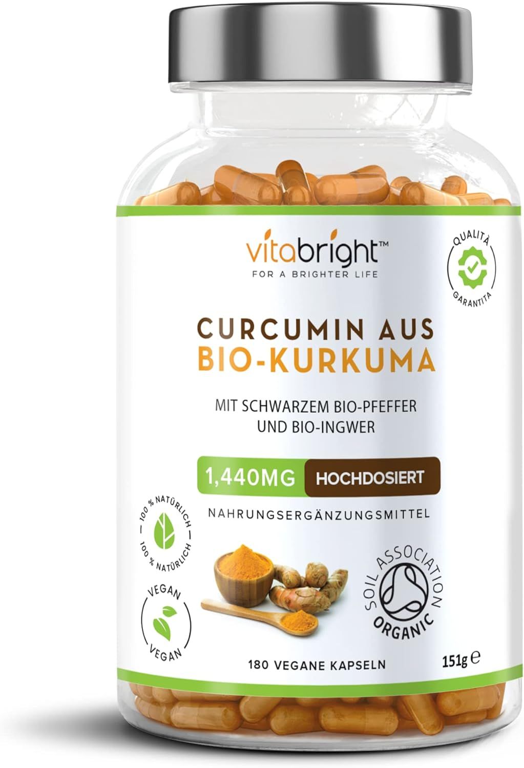 INGREDIENTI BIOLOGICI AD ALTO DOSAGGIO: Le nostre capsule di curcuma al pepe nero e zenzero sono di altissima qualità, poiché tutti i nostri ingredienti sono certificati biologici dalla Soil Association e recano il logo biologico dell'UE. Ogni dose contiene 1440 mg di curcuma biologica, pepe nero biologico e zenzero biologico. Non utilizziamo leganti, riempitivi o additivi non salutari che spesso si trovano nelle compresse di curcuma.