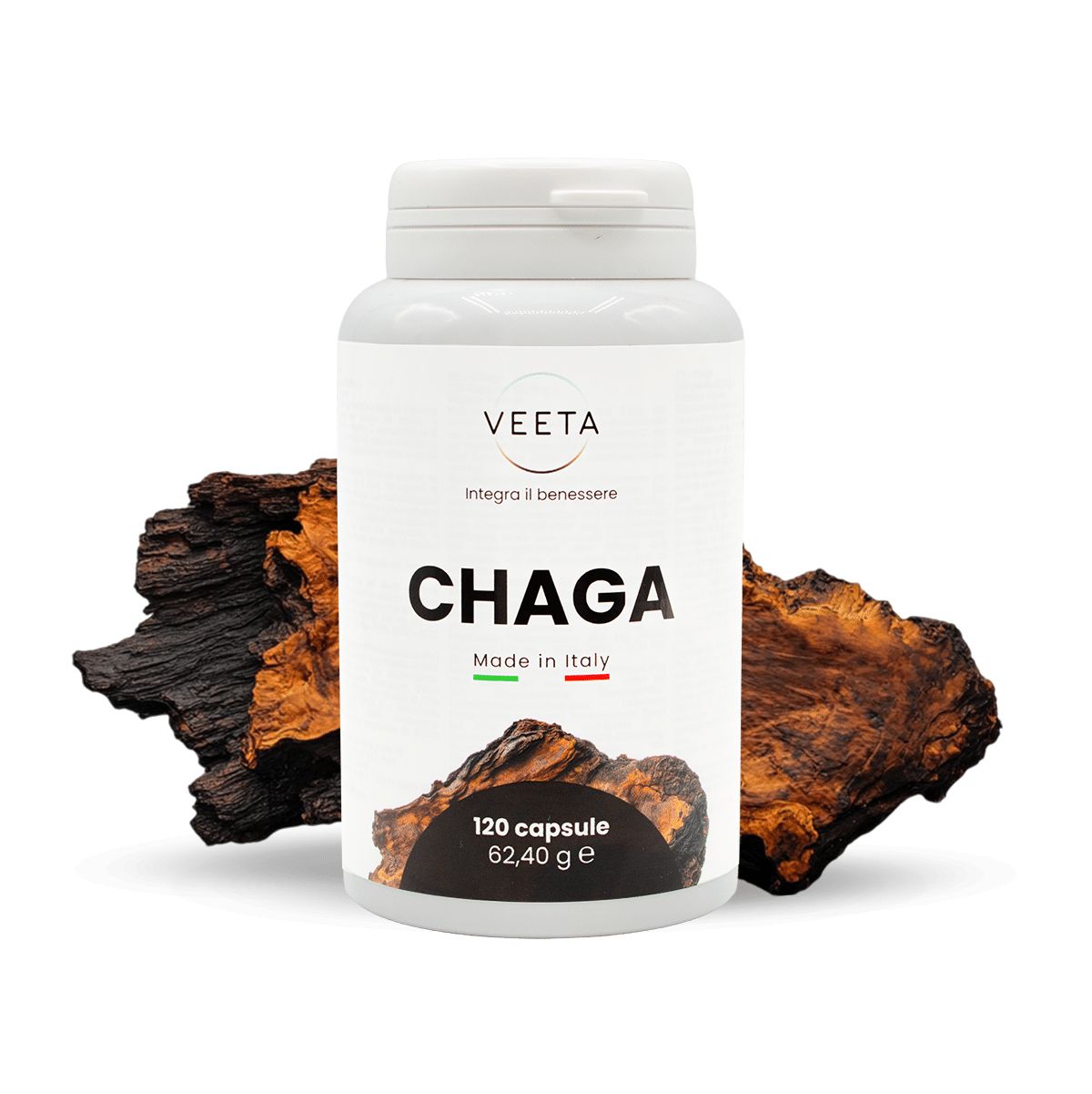 Veeta Chaga 120 capsule è un integratore a base di Inonotus obliquus (Chaga), ottenuto dallo sclerozio che vive sulla betulla. L’estratto è standardizzato al 30% in polisaccaridi (β-glucani) e, per natura, contiene melanina e triterpeni come betulina e acido betulinico. La formula vegana è completata da Vitamina C da Rosa canina e SOD (Superossido dismutasi). Pensato per la routine di tutti i giorni: supporto a immunità, energia costante e protezione ossidativa. Il formato 120 capsule Made in Italy assicura continuità e, con i valori dichiarati per capsula, sai sempre cosa stai assumendo.