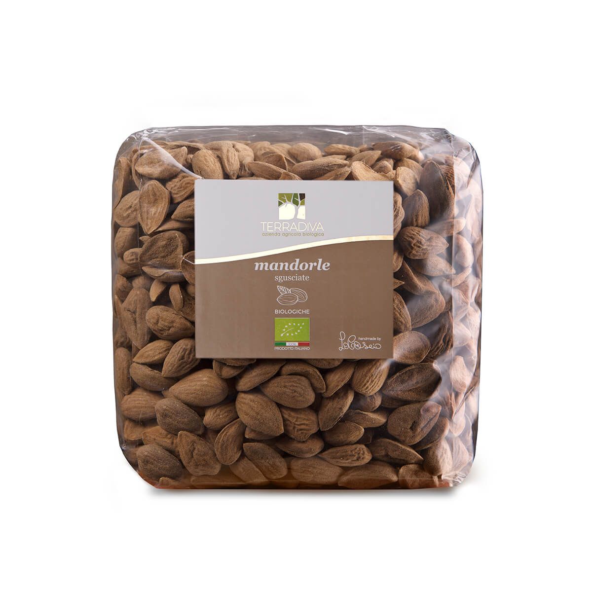 mandorle biologiche, senza guscio, al naturale, con la pelle marrone, selezionate e confezionate a mano.