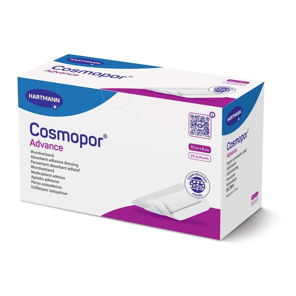 Associazione post-operatoria di Hartmann Cosmopor® per la cura delle ferite postoperatorie, ma anche per cure sterili per lesioni minori, ad es. B. come parte del pronto soccorso; in pazienti con pelle sensibile. Cosmopor® Anticipo è con l'innovativa barriera secca® La tecnologia equipaggiata che consente di includere lo studio WoundX di essere incluso nel cuscino della ferita, ma non viene rilasciata, nemmeno sotto pressione. Questa combinazione di elevata capacità di aspirazione e il backwear più basso consente che l'associazione post-operatoria possa rimanere più a lungo sulla ferita. L'anticipo è un'associazione sterile di ferita autoadesiva realizzata in vello di trasporto morbido, dotato di una ferita altamente assorbente.