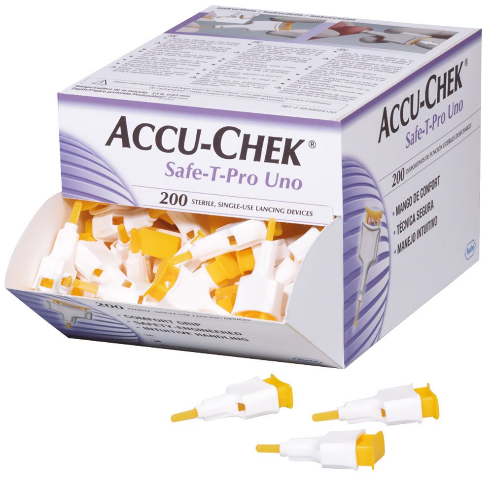 Marca: Accu-Chek. Modello: Safe-T Pro Uno. Quantità: 200 pezzi (unità: St). Destinazione d'uso: prelievo capillare per il monitoraggio della glicemia. Produttore: Roche Diabetes Care Italy Spa. Dimensioni confezione: 142x157x118 mm.