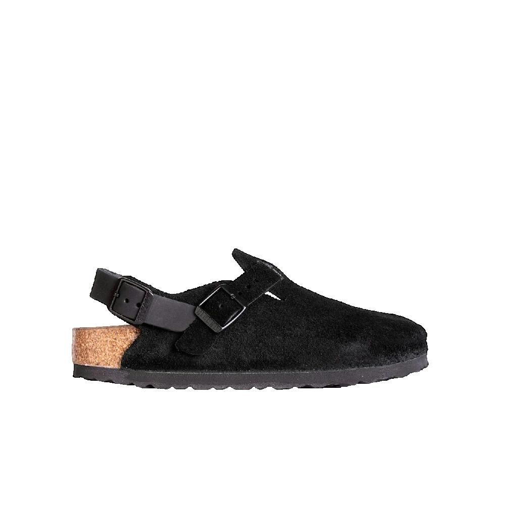 Mocassini Birkenstock in pelle scamosciata nera, caratterizzati da una punta tonda, una fibbia regolabile in metallo sulla fascia anteriore, una fascia regolabile sul tallone, una soletta anatomica in sughero e lattice e una suola in gomma EVA.