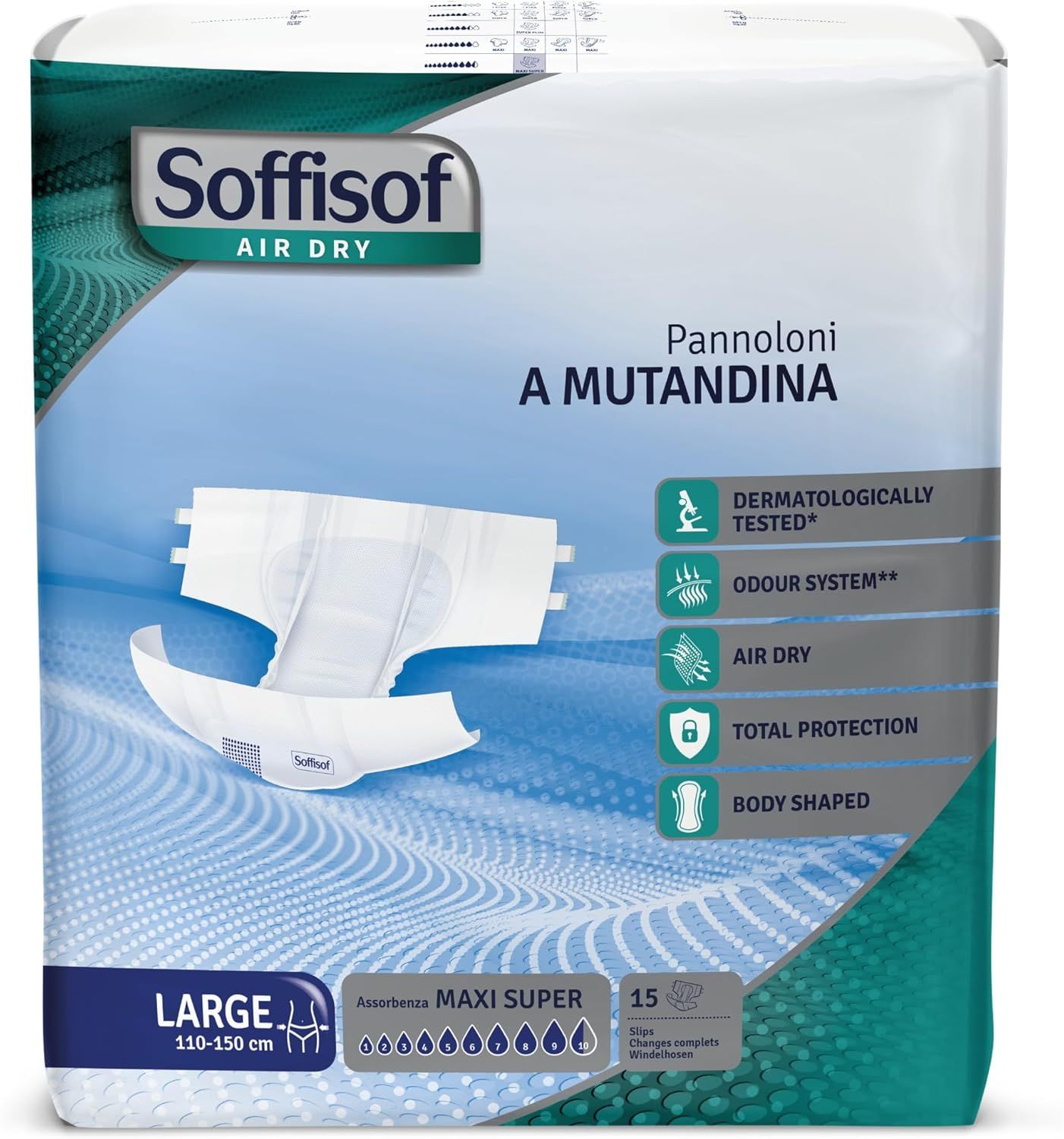 ISoffisof Air Dry Maxi Super sono i pannoloni con adesivi ideali per chi necessita di una protezione avanzata e affidabile contro l'incontinenza urinaria e fecale. Grazie all’integrazione della tecnologia Air Dry e ai materiali dermatologicamente testati, offrono comfort, traspirabilità e sicurezza anche in situazioni di particolare esigenza, come per persone allettate o durante la notte.