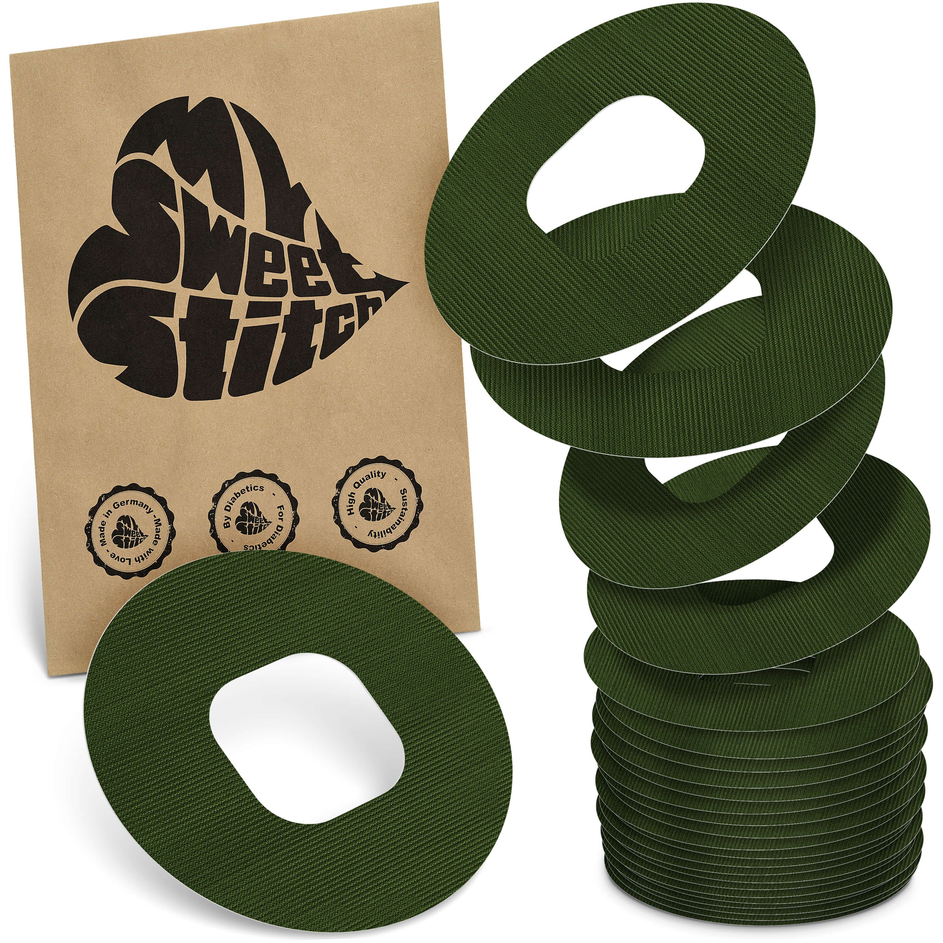 Ringpatch MySweetStitch per stabilizzare il sensore CGM con forma aperta e fissaggio mirato.