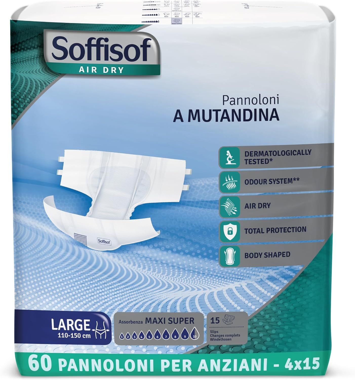 ISoffisof Air Dry Maxi Super sono i pannoloni con adesivi ideali per chi necessita di una protezione avanzata e affidabile contro l'incontinenza urinaria e fecale. Grazie all’integrazione della tecnologia Air Dry e ai materiali dermatologicamente testati, offrono comfort, traspirabilità e sicurezza anche in situazioni di particolare esigenza, come per persone allettate o durante la notte.
