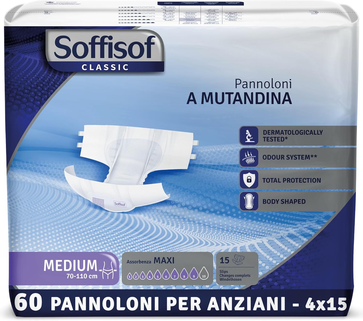 Soffisof Classic è la soluzione ideale per coloro che cercano una protezione affidabile e discreta contro l’incontinenza moderata. Un pannolone pensato per offrire benessere, libertà e serenità nella vita di tutti i giorni.