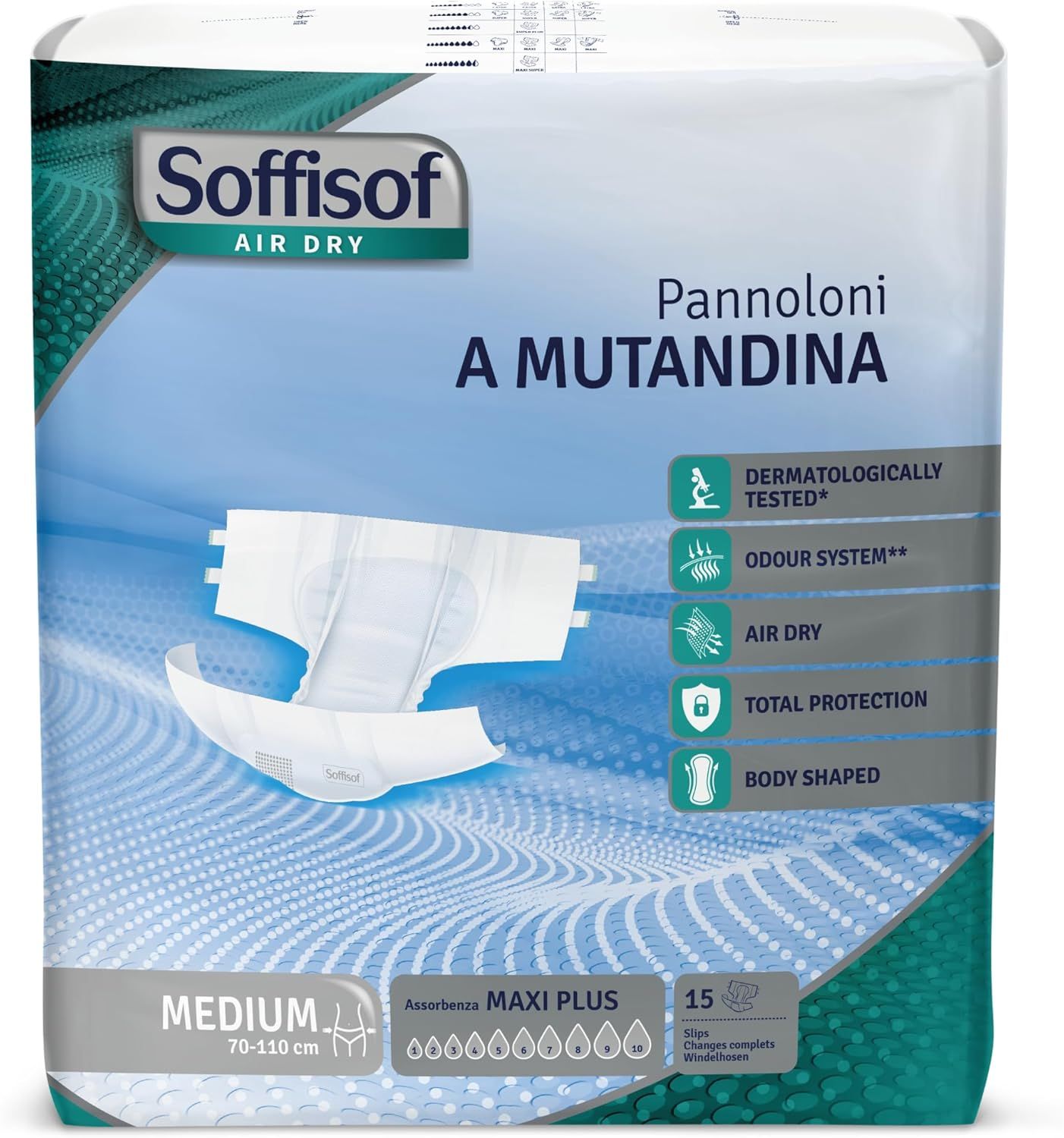 ISoffisof Air Dry Maxi Plus sono i pannoloni con adesivi ideali per chi necessita di una protezione avanzata e affidabile contro l'incontinenza urinaria e fecale. Grazie all’integrazione della tecnologia Air Dry e ai materiali dermatologicamente testati, offrono comfort, traspirabilità e sicurezza anche in situazioni di particolare esigenza, come per persone allettate o durante la notte.