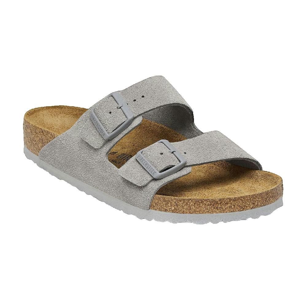 Sandali Birkenstock Arizona in suede grigio con plantare anatomico in sughero-lattice e suola in EVA.