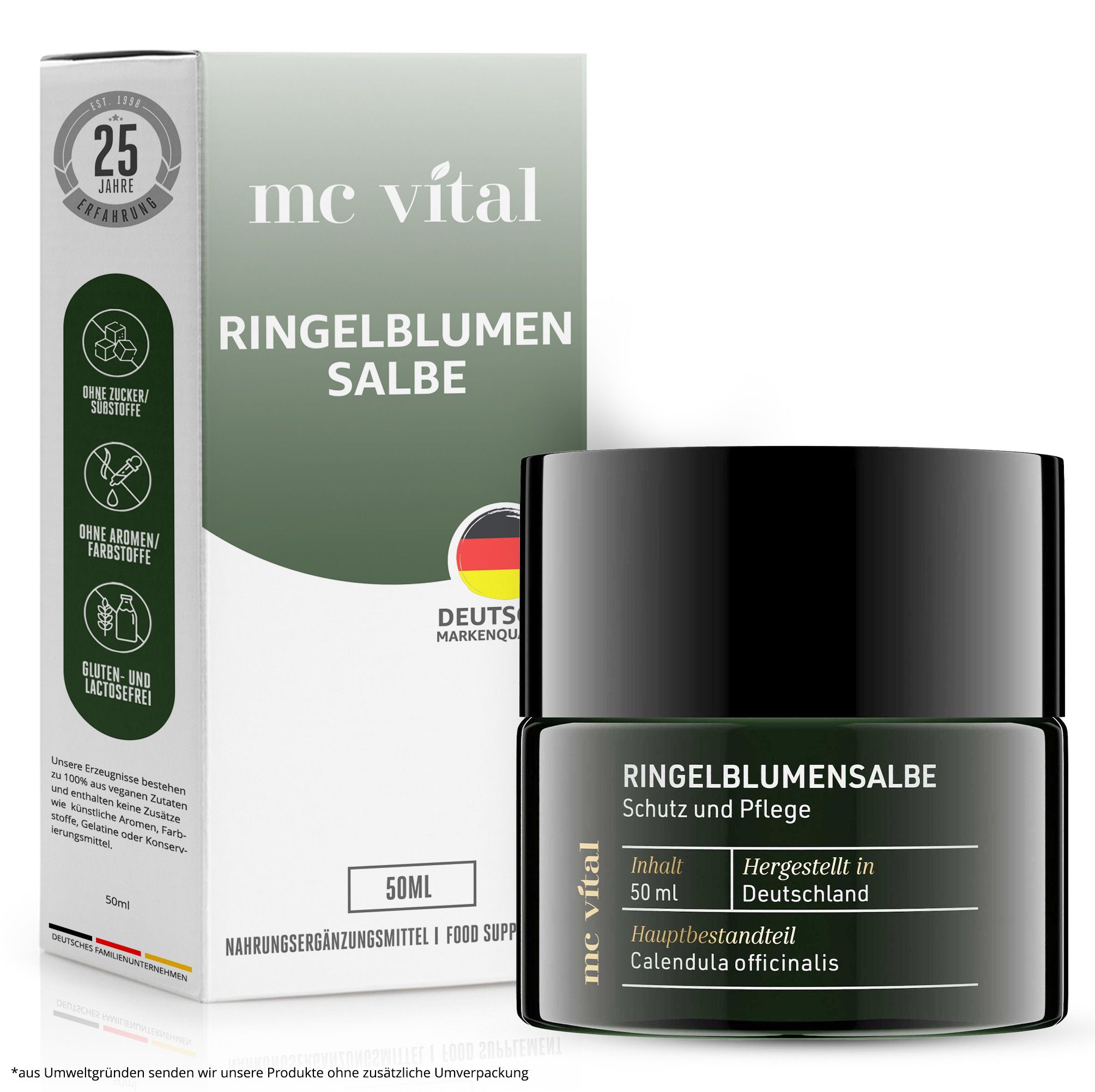 CI ASSUMIAMO LA RESPONSABILITÀ – Le nostre confezioni sono realizzate al 100% in vetro riciclato e sono riutilizzabili. Diamo importanza alla produzione ecologica in Germania, senza test sugli animali.
