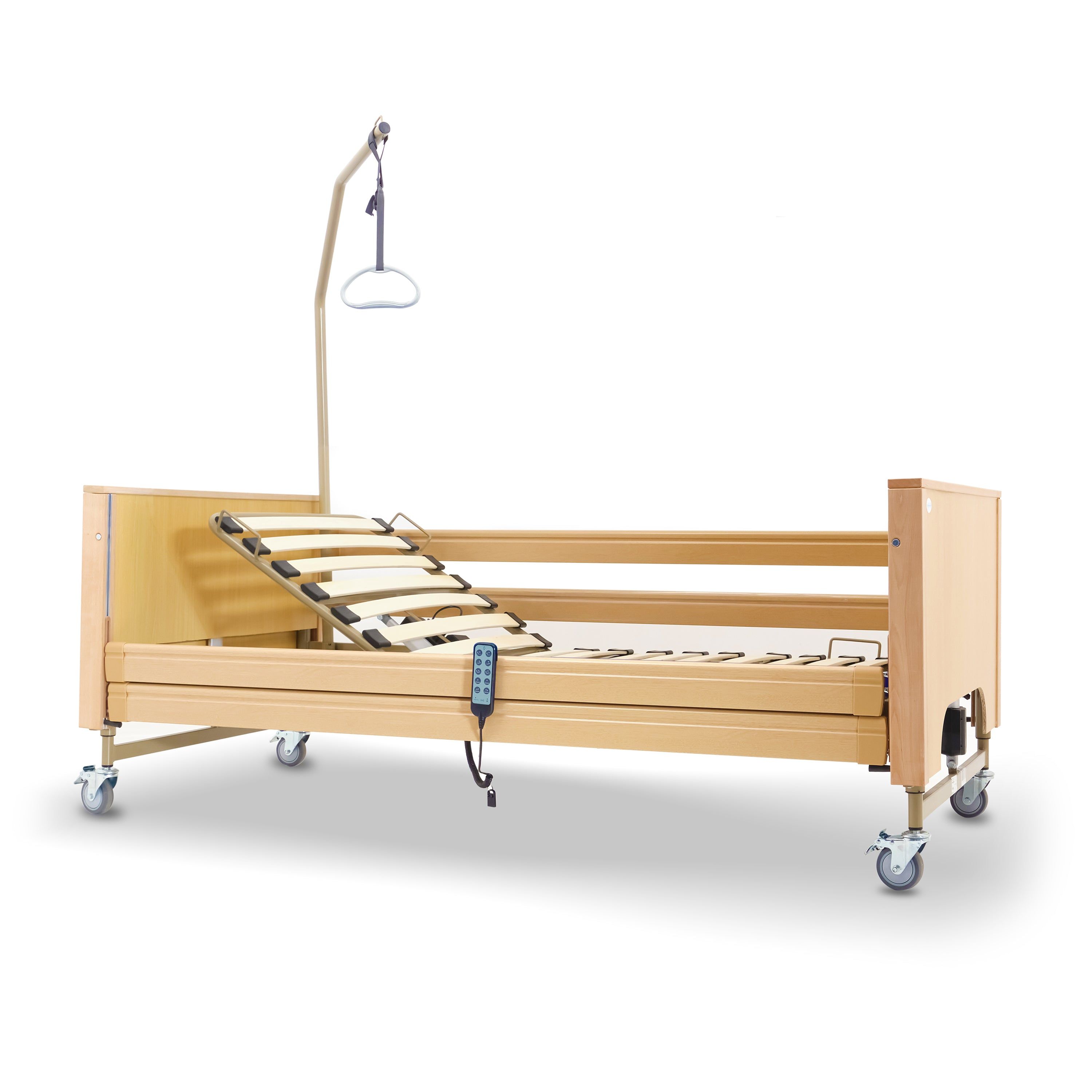 Letto elettrico ospedaliero in legno con sponde Armonia Il Letto Elettrico da Degenza Ortopedico per Disabili e Anziani ad Altezza Variabile con Rete Pieghevole, Sponde e Alzamalati Armonia è il dispositivo ideale per prendersi cura dei propri cari nel comfort della propria casa. Con le stesse caratteristiche di un letto ospedaliero, questo letto è adatto per lunghe degenze, periodi di riabilitazione o per malati allettati. Letto con rete elettrica per anziani: Caratteristiche ortopediche Come dispositivo medico, questo letto ortopedico è progettato per dare il corretto sostegno alla colonna vertebrale, alla muscolatura e agli arti. Per ottenere il massimo beneficio, è importante abbinare la struttura del letto ad un materasso adatto, come per esempio un materasso antidecubito o a sezioni. Letto ospedaliero: Rete pieghevole e movimentata La rete del letto si solleva in più punti. La parte del busto si solleva trasformandosi in uno schienale per mangiare, leggere o guardare la TV. La parte della rete in corrispondenza delle gambe si solleva per dare sollievo alle gambe e al bacino. Queste parti si sollevano e si abbassano in modo indipendente o simultaneo a seconda dei casi. Letto motorizzato: Altezza regolabile con telecomando Le gambe del letto si sollevano simultaneamente per regolare l’altezza del letto da 43 a 86 cm oppure a coppie per poter creare un inclinazione di 10°. Tutti i movimenti sono governati da un telecomando illustrato facile da usare. Letto disabili: sponde e alzamalati Per garantire la massima sicurezza, il letto è dotato di sponde mobili facili da usare che impediscono di cadere o scivolare dal letto. L’asta sollevamalati è posizionabile a destra o sinistra della struttura del letto, oppure può essere rimossa qualora non servisse. Specifiche tecniche Lunghezza Rete 200 cm Lunghezza Totale 220 cm Larghezza Rete 90 cm Larghezza Totale 105 cm Inclinazione alza busto 70° Inclinazione alza gambe 30° Trendellemburg - Anti-trend. 10°/ -10° Altezza minima rete dal suolo 43 cm Altezza massima rete dal suolo 86 cm Peso complessivo 105 kg Portata massima 180 kg Classe di protezione IPX4