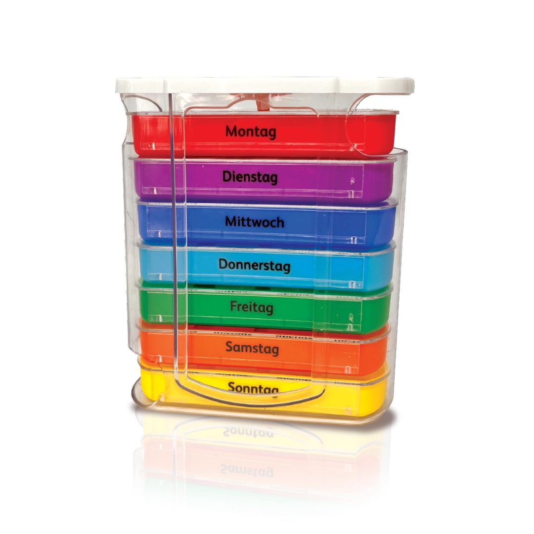 Grazie alla codifica a colori, il porta pastiglie settimanale onsente di distinguere in modo chiaro e semplice gli scomparti giornalieri. Ciò facilita una rapida assegnazione e garantisce una chiara organizzazione dei farmaci.