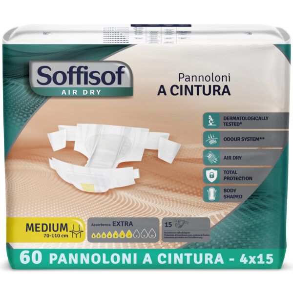 Soffisof Pannoloni con Cintura è la linea di pannoloni per adulti progettata per offrire elevato assorbimento, traspirabilità e una vestibilità personalizzata grazie al sistema di chiusura con cintura elastica. Indicato per chi ha esigenze di incontinenza moderata e cerca comfort e sicurezza anche in movimento.