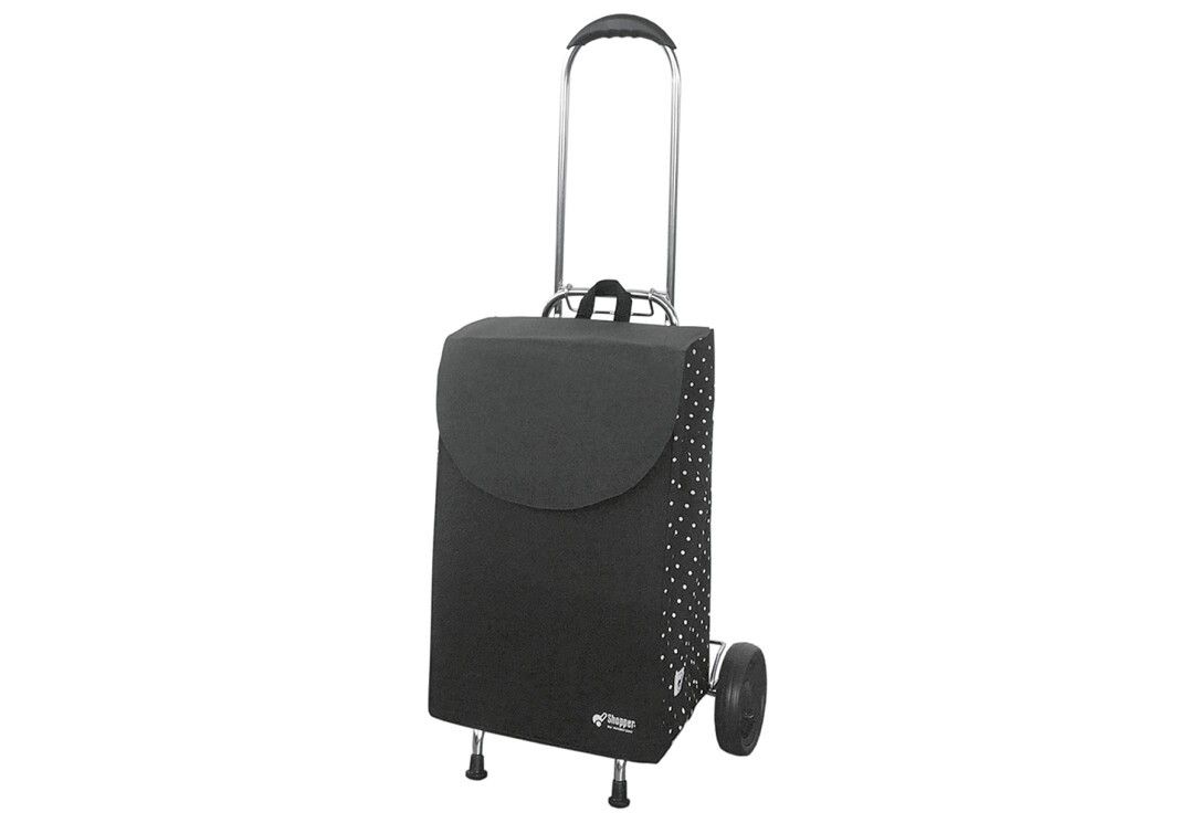 Der Shopper-By-Andersen Einsteiger. Chromatisiertes Stahlrohrgestell mit abfaltbarem Griff, stabil und praktisch. Moderne kleine Tasche aus mattem Gewebe mit weißen Punkten.Technische Details: Name Wert Marke Andersen Farbe schwarz Höhe 106 cm Gewicht 1.8 kg Volumen 40 l Eigenschaften faltbarer Griff, Räder leicht abnehmbar, Leichtlaufräder, Spurbreite 45 cm, Raddurchmesser 15 cm Fahrgestell Höhe 106 cm, Gewicht Fahrgestell 1,8 kg, Fahrgestelltragkraft 40 kg, Tasche mit Reflektoren, Seitentasche, wasserabweisend, Tasche leicht abnhem Sicherheitsmerkmale Tasche mit Reflektoren