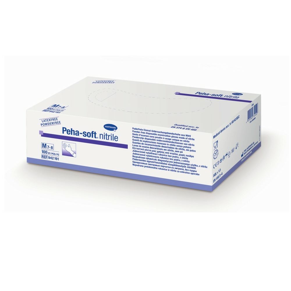 Gli Hartmann Peha-Soft® Nitrile Powderfree sono esami unici senza lattice e guanti protettivi in gomma nitrile di colore blu morbido. Sono senza polvere e facilmente attratti da un rivestimento interno clorato. L'area del dito strutturato garantisce una presa ottimale. È anche altamente elastico, in particolare resistente alle lacrime e convince con la sua vestibilità eccellente e un tocco eccellente.