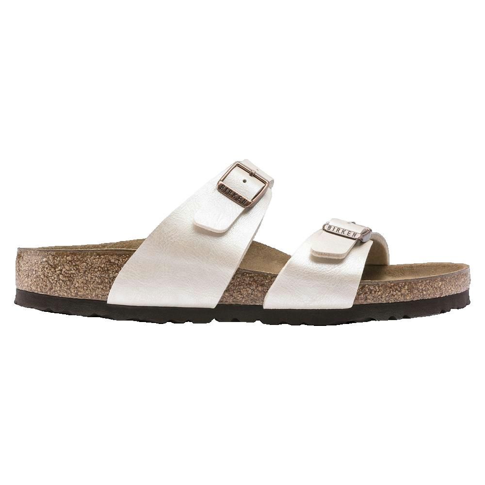 Le sandali Sydney Pearl Etroite di Birkenstock sono sinonimo di benessere e comfort grazie alla loro suola anatomica, simbolo del successo del marchio. Questo modello unisex per adulti, di colore bianco con fibbia dorata, è realizzato in birko-Florverniciato, un materiale sintetico di alta qualità. Perfette per l'estate, queste calzature sono un must-have per il tuo guardaroba. Si consiglia di scegliere una misura inferiore rispetto alla propria abituale, poiché calzano grandi. Birkenstock è sinonimo di affidabilità e comfort da oltre 10 anni.