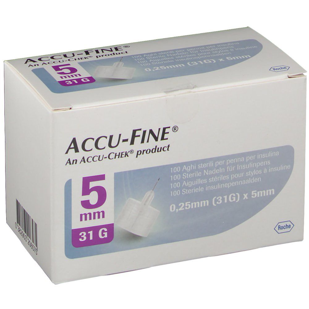 Aghi sterili per penna per insulina, privi di lattice. Calibro 31G (0,25 mm) e lunghezza 5 mm per somministrazioni precise. Confezione da 100 pezzi adatta all'uso continuativo. Cod. 09583955001; produttore Roche Diabetes Care Italy Spa.