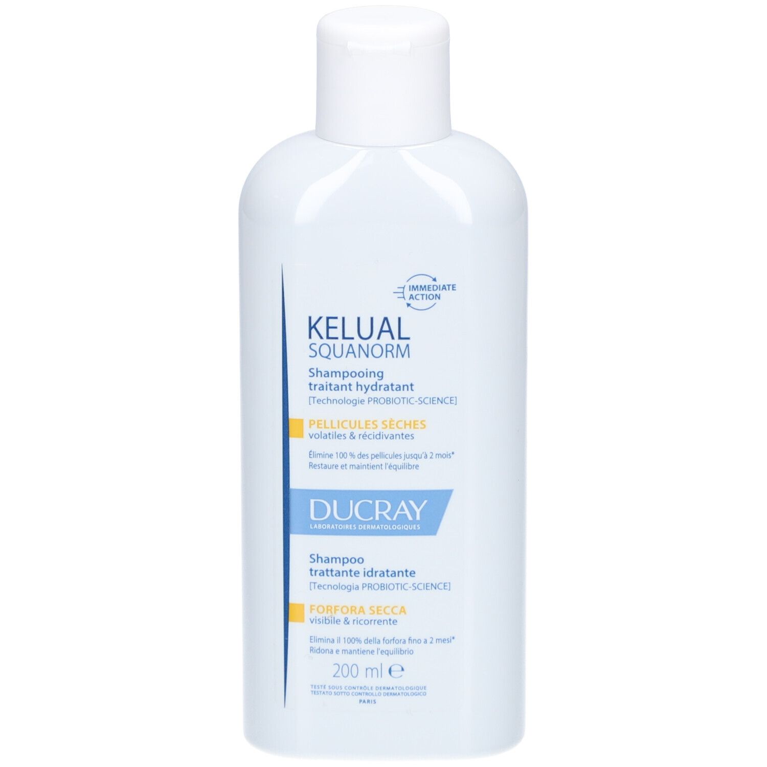 Shampoo antiforfora per forfora secca Kelual Squanorm, formato 200 ml in flacone; marca Ducray (Pierre Fabre It. Spa); peso con imballo 500 g.