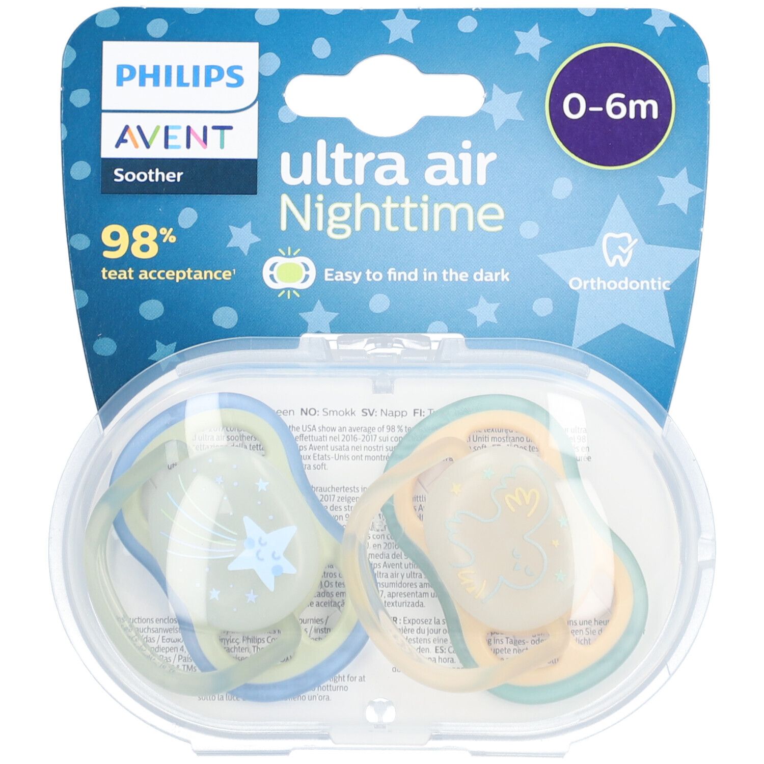 Philips Avent Ultra Air Night Time – succhietto per neonati 0-6 mesi; design Stella Cometa/Gufo; prodotto da Philips Spa.