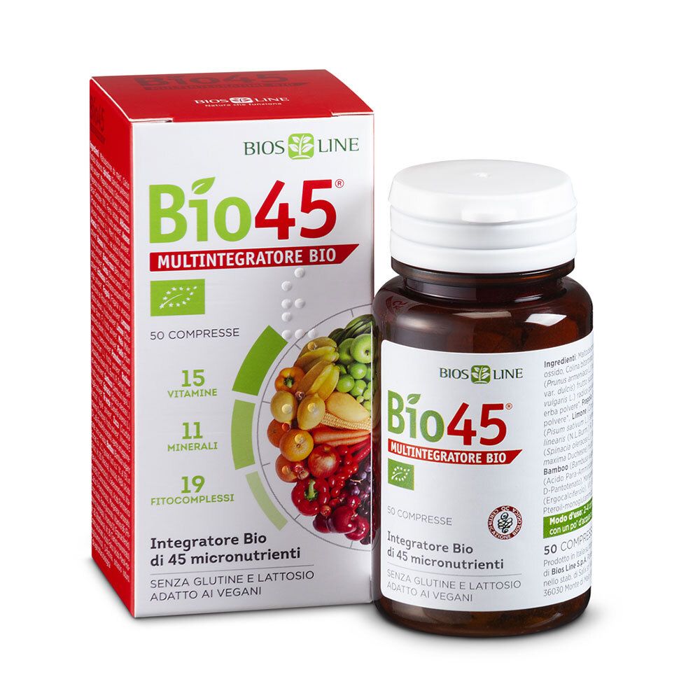 Bio45 è un integratore alimentare completo di Vitamine, Minerali ed estratti Vegetali da agricoltura biologica certificata; risulta particolarmente utile quando è richiesto un apporto supplementare di questi componenti: una vera marcia in più, o una valida integrazione in caso di alimentazione poco curata.