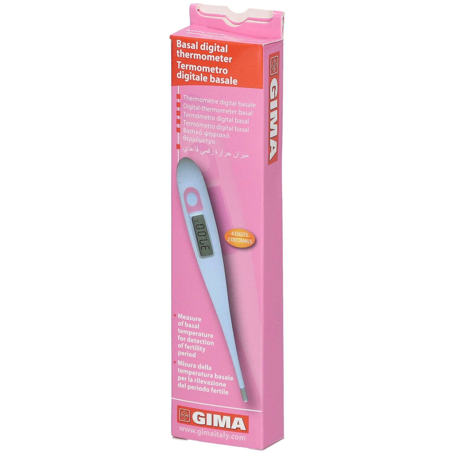 Termometro digitale specifico per la misurazione della temperatura basale; design compatto e portatile per uso quotidiano; display digitale facilmente leggibile per una lettura chiara; utilizzo semplice e intuitivo adatto al monitoraggio regolare; prodotto da Gima Spa (Via Monza 102, 20060 Gessate MI).