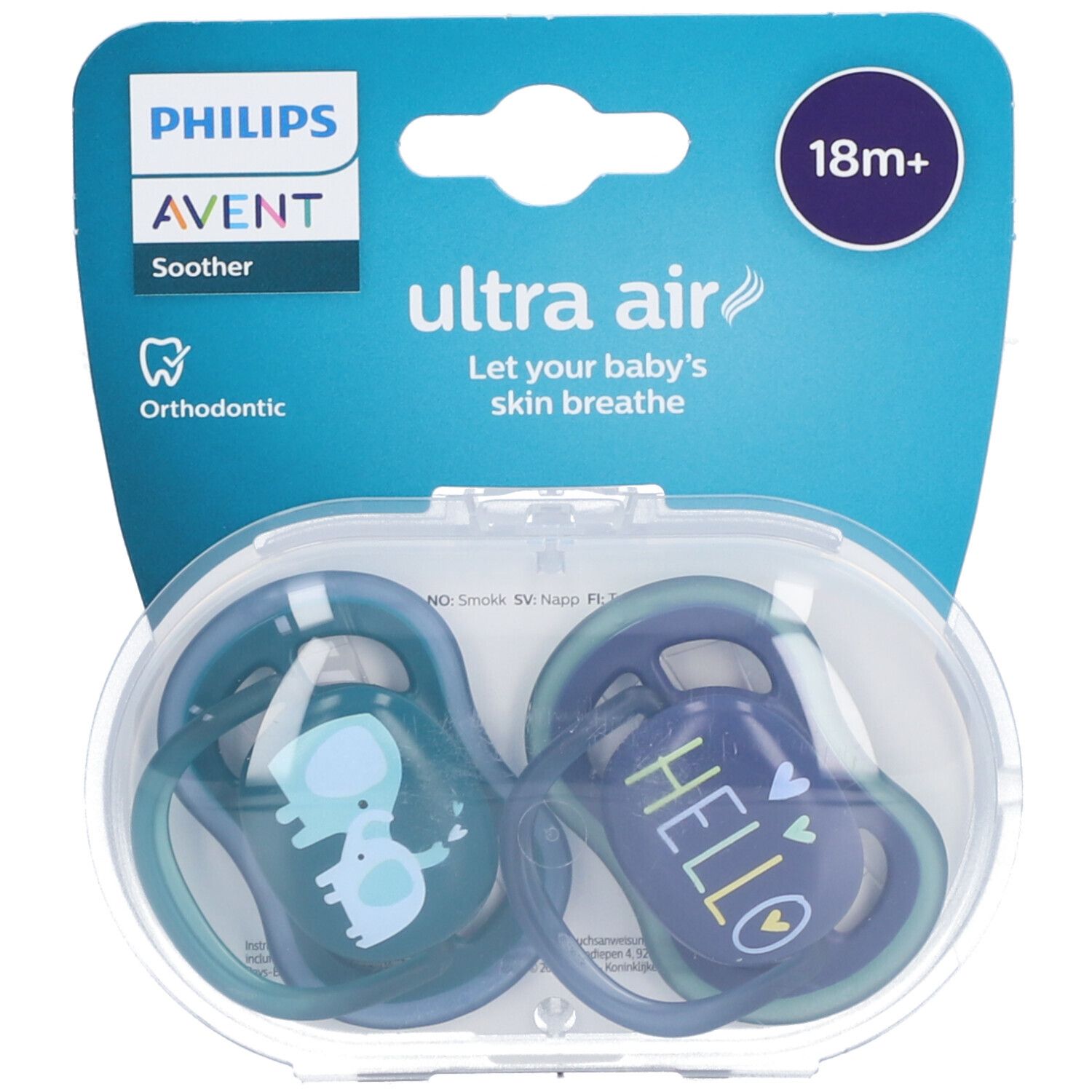 Philips Avent Ultra Air: succhietto per bambini dai 18 mesi. Motivo Elefanti/Hello. Prodotto da Philips Spa, Viale Sarca 235, Milano. Peso confezionato: 50 g.