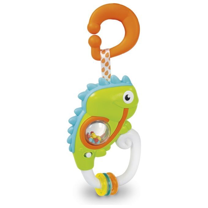 Il simpatico sonaglino a forma di camaleonte diventerà il passatempo dei più piccoli! Muovendolo il sonaglino attiva allegre melodie ed effetti sonori, mentre le palline nella pancia del camaleonte e i ciondoli colorati attirano l'attenzione del bambino stimolando la percezione tattile Il pratico gancio è perfetto per appendere il sonaglino e portarlo sempre con sé.