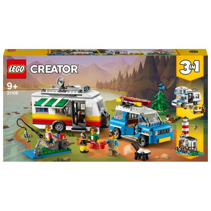 Questo set offre ai bambini 3 opzioni di gioco: un LEGO® Creator 3 in 1 Vacanze in Roulotte (31108), un camper o un faro. Il set include inoltre 3 minifigure e 3 animali costruiti con mattoncini per aumentare il divertimento.