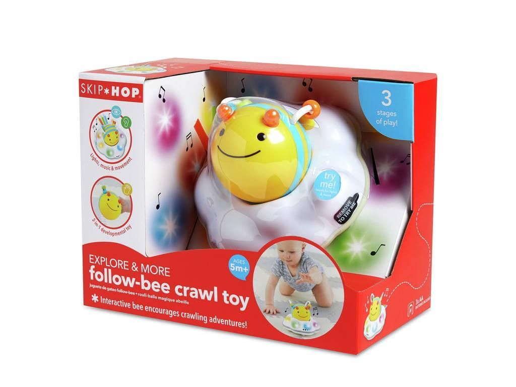 Il giocattolo interattivo Explore & More da crawling Ape promuove i primi tentativi di strisciare dei piccoli. Il giocattolo motorizzato è progettato per crescere con il bambino in tre fasi. Fase 1 (prima che il tuo bambino gattoni): razze di api facili da afferrare che oscillano, ma non cadono. Fase 2 (inizia a gattonare): la nuvola si muove in movimenti circolari e rimane vicina, in modo che i principianti del gattonare non debbano allontanarsi troppo. Fase 3 (gattonare avanzato): la nuvola si muove in traiettorie casuali e ruota su se stessa quando l'ape viene rimossa. Il giocattolo incoraggia i piccoli con luci colorate, melodie divertenti e suoni ronzanti per sviluppare il proprio movimento. Il sensore evita ostacoli.