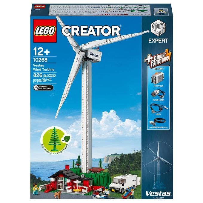 Celebra l’innovazione dell’energia eolica con la turbina eolica Vestas 10268 LEGO® Creator Expert. Sviluppato in collaborazione con Vestas, questo modello LEGO dettagliato e motorizzato cattura l’eleganza e il movimento aggraziato di una tradizionale turbina eolica e contiene un nuovo abete rosso - novità di gennaio 2019 - fabbricato con plastica di origine vegetale sostenibile. Alta circa 1 m, la struttura torreggia su una collina boscosa e una casetta dotata di patio con mobili, cassetta postale, fiori e una staccionata bianca. Ruota la gondola motrice verso sinistra o destra e attiva il motore Power Functions incluso per far girare le pale della turbina eolica e illuminare la luce del portico della casa. Questo modello collezionabile è stato progettato per offrire un'esperienza di costruzione stimolante e gratificante, con un pizzico di nostalgia e fascino d'epoca, ed è inoltre un fantastico modello da esporre a casa o in ufficio. Questo grande set LEGO include anche un veicolo di servizio Vestas e 3 minifigure: 2 tecnici Vestas dotati di caschi di sicurezza e una donna, più un cane.