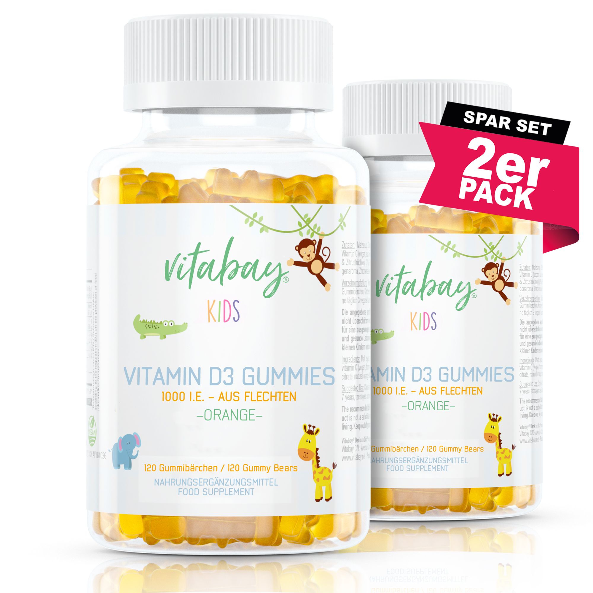 Bambini da 2 a 7 anni, adolescenti e adulti 1 orsetto gommoso vegano al giorno. Ciò corrisponde a un'assunzione giornaliera di 25 g (1000 U.I., 500% RM).