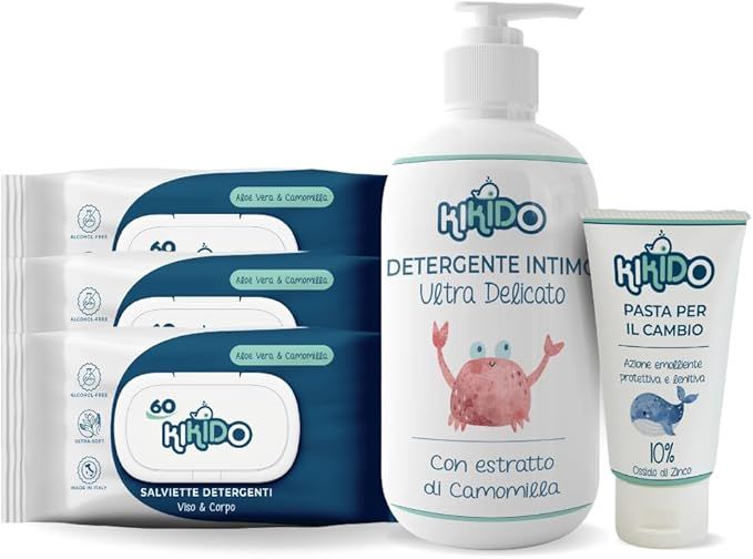 Kit Cambio Pannolino Kikido: Salviettine Umidificate, Pasta Cambio e Detergente Intimo Delicato