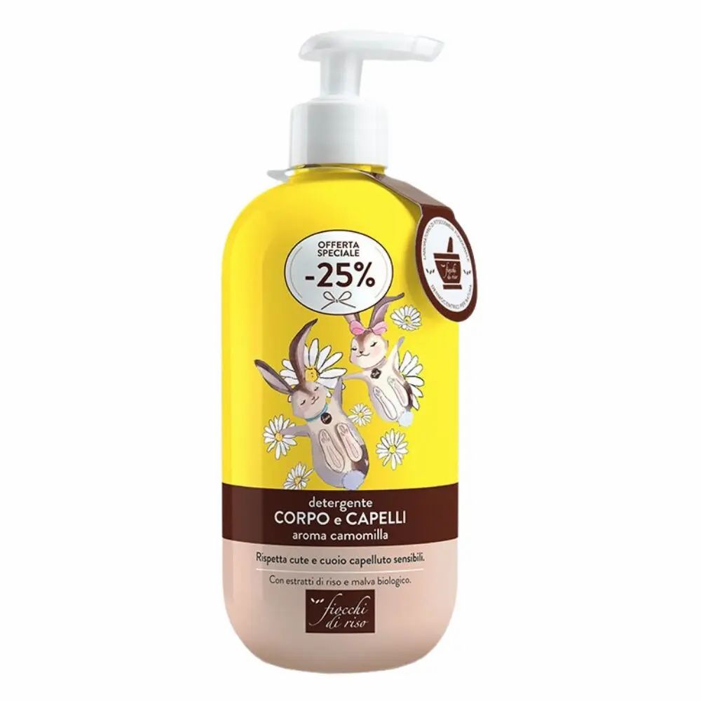 Detergente Corpo e Capelli Camomilla Fiocchi di Riso: deterge delicatamente pelle e capelli sensibili.