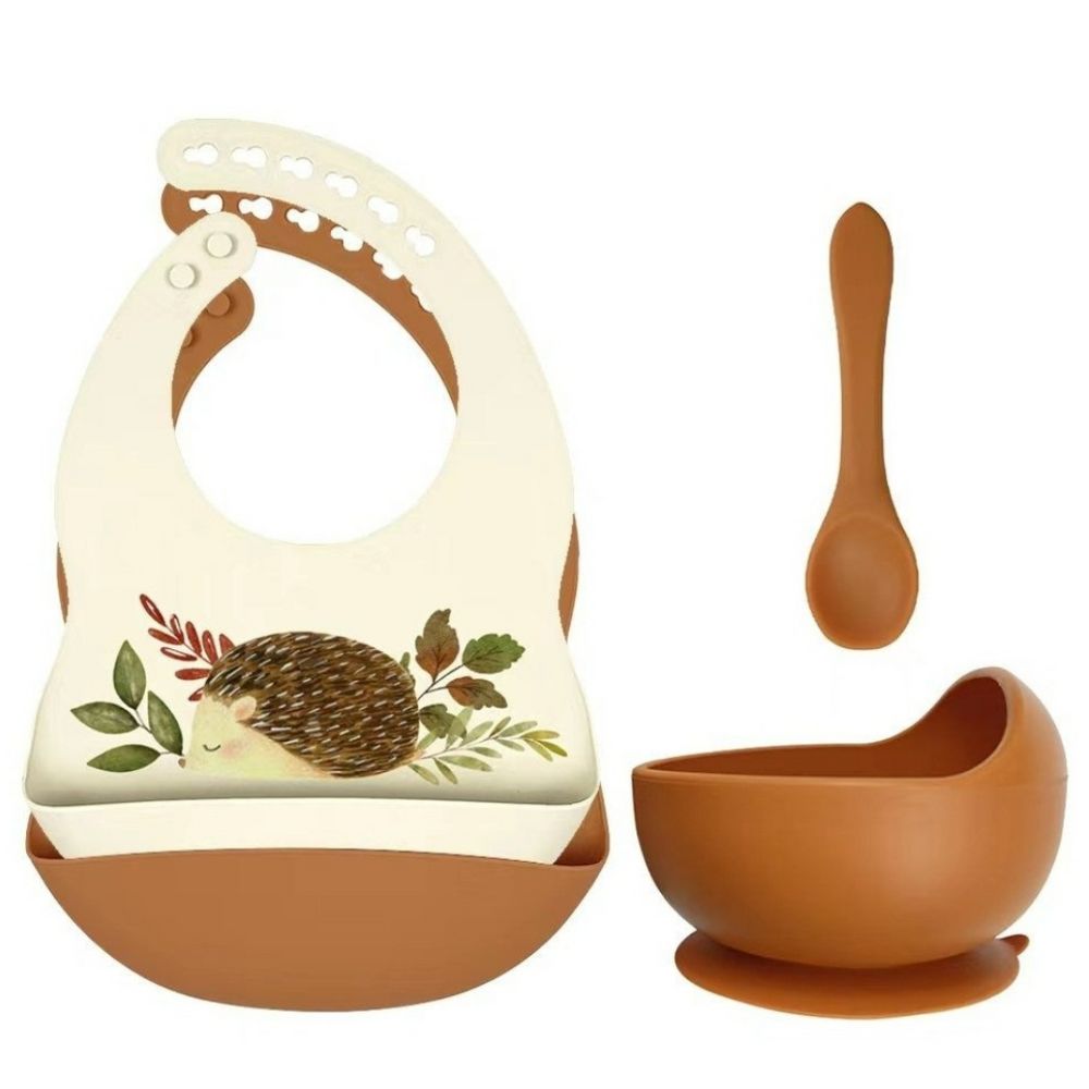 Set di bavaglini in silicone con ciotola con ventosa e cucchiaio - Riccio - Marrone ruggine