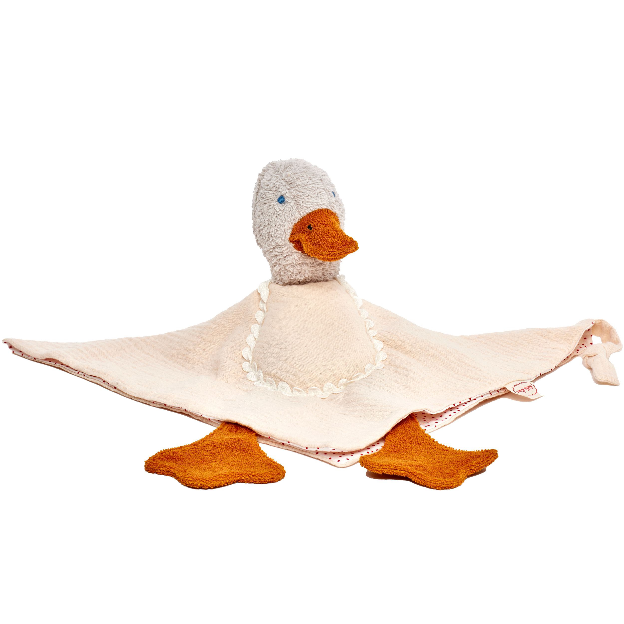 L'Anatra Eli non vede l'ora di sdraiarsi sulla pancia del bambino. La sua testa in frottee di cotone guarda leggermente di lato, in modo da potersi adattare ancora meglio. Sul lato del panno da coccolare in morbido mussola c'è un cordoncino per il ciuccio. I grandi piedi di Eli in cotone picco invitano a essere afferrati e giocati. Il panno è doppiato con una bella stampa a pois. Buono a sapersi: tutti i materiali sono certificati oekotex 100 classe di produzione 1.