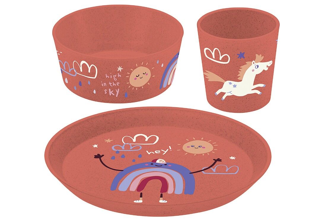 Set di stoviglie per bambini da 3 pezzi di Dreams: sole, nuvole, arcobaleni e tanti pony, tutto ciò che serve per essere felici. Il set di stoviglie con le incantevoli illustrazioni incanta a prima vista. Il piatto piccolo è ideale per frutta e spuntini sani, mentre la ciotola piccola diventa subito indispensabile per il muesli o per piccoli piatti. La tazza compatta è facile da impugnare per le piccole mani e non necessita di manico. CONNECT DREAMS è robusto, leggero e impilabile, un vero e proprio tuttofare per tutti i giorni. Contenuto: 1 tazza da 190 ml, 1 ciotola da 400 ml, 1 piatto da 20,5 cm. Materiale: materiale biocircolare/legno certificato FSC, robusto, leggero e impilabile | sicuro per gli alimenti | lavabile in lavastoviglie | riciclabile al 100% | neutrale al 100% in termini di CO2.Dettagli tecnici: Nome Valore Paese di origine Hesse Lunghezza 23 CM Larghezza 21,5 CM Altezza 9 CM Unità di misura per la dimensione della rete 2 Larghezza dell'imballaggio 20,50 Altezza dell'imballaggio 8,50 Dimensioni dell'imballaggio dell'unità di misura cm Peso 0,25 Unità di misura peso 0,252 KG