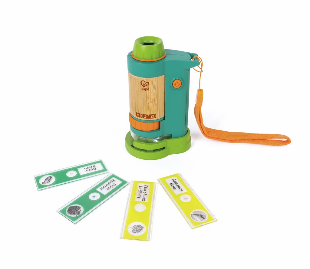 Giocattolo educativo ideale e fedele compagno per piccoli esploratori! Il fantastico microscopio in bambù si adatta perfettamente alle piccole mani, che possono portarlo e tenerlo durante le loro avventure di esplorazione.