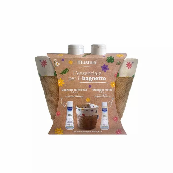 Cofanetto Mustela con prodotti delicati per bagnetto e shampoo, completo di cestino in juta elegante e funzionale.