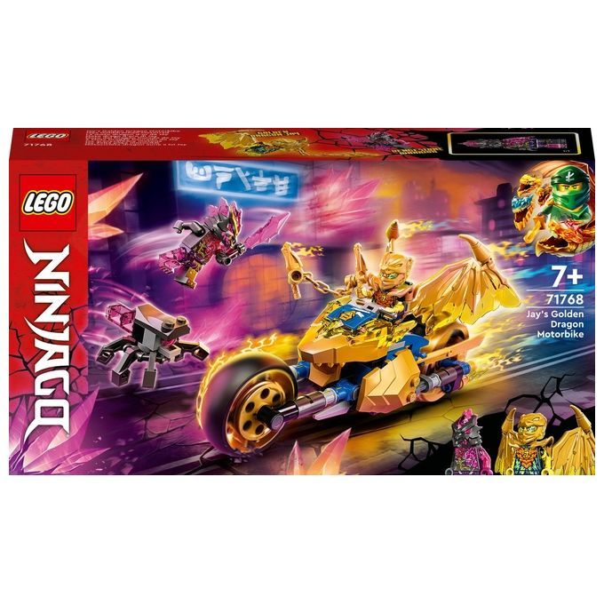 Il playset Moto Drago d’Oro di Jay LEGO® NINJAGO® (71768) contiene tutto ciò che serve a un fan dei ninja dai 7 anni in su per ricreare le scene avvincenti della serie TV NINJAGO: Crystallized. Questa moto giocattolo NINJAGO è caratterizzata dalla testa di un drago d’oro con fauci mobili e pannelli laterali dorati.