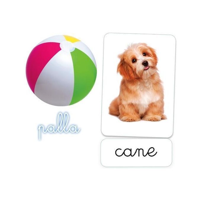Contiene: 15 carte parlate che riportano immagini fotografiche e nomi di oggetti familiari al bambino, 15 carte mute con solo le immagini degli stessi oggetti e 15 cartellini con i nomi.