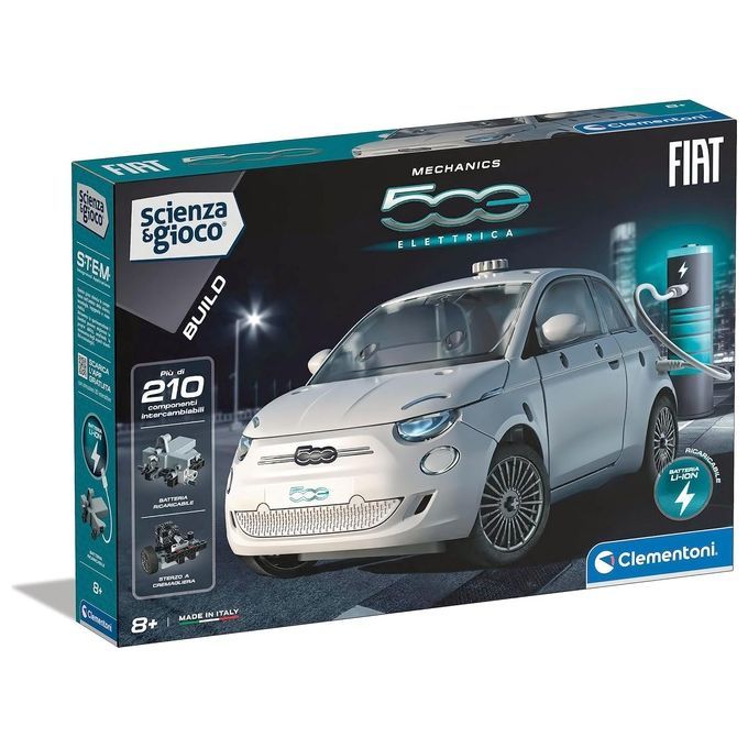 Un kit di costruzioni con cui divertirsi a realizzare il modello della FIAT 500 elettrica. Il modello è azionato da un motore elettrico alimentato da una batteria a litio ricaricabile. L'app Scienza gioco Build integra l'esperienza di gioco fornendo un supporto al montaggio grazie alle animazioni 3D interattive. Nel kit vengono forniti tutti i componenti per assemblare l'auto e i suoi meccanismi interni: sterzo a cremagliera e trasmissione differenziale. Un simbolo dell'innovazione del brand FIAT per conoscere le auto elettriche e il futuro della mobilità.