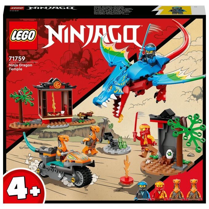 Il playset Il tempio del Ninja dragone (71759) favorisce lo sviluppo delle capacità di costruzione nei bambini dai 4 anni in su. È caratterizzato da un drago snodabile, 2 templi ninja, 2 alberi snodabili, un uovo di drago e 4 minifigure: i ninja Kai e Nya, e i cattivi Cobra meccanico e Subdolo Serpente.
