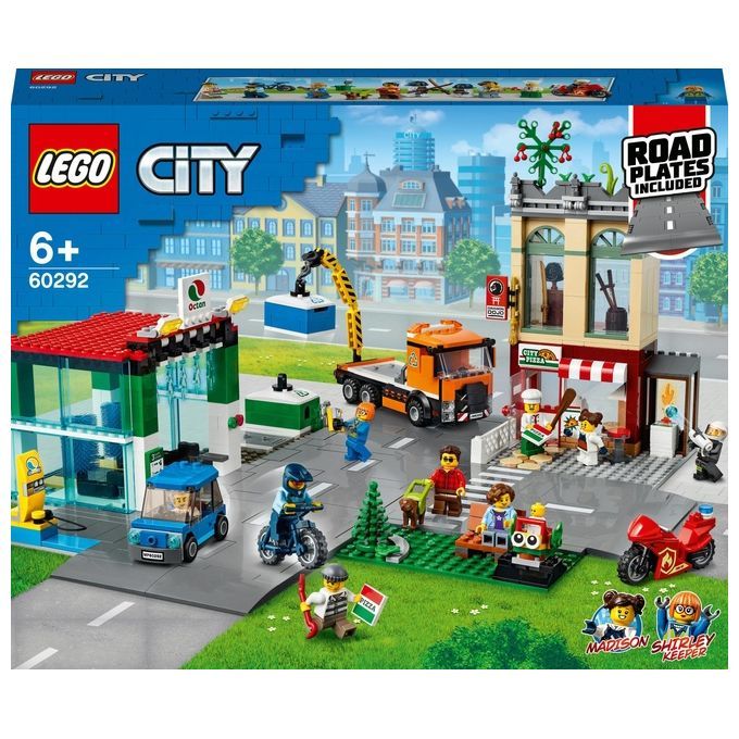 Il set di gioco premium Centro città LEGO City (60292) permette ai bambini di rivivere la serie TV LEGO® City Adventures. Include: pizzeria, isola ecologica, autolavaggio, stazione di ricarica per veicoli elettrici, dojo per arti marziali e parco con giostra, oltre alle minifigure dei personaggi di LEGO City. Le basi stradali LEGO City incluse possono essere collegate alle basi stradali di altri set per ampliare la città.
