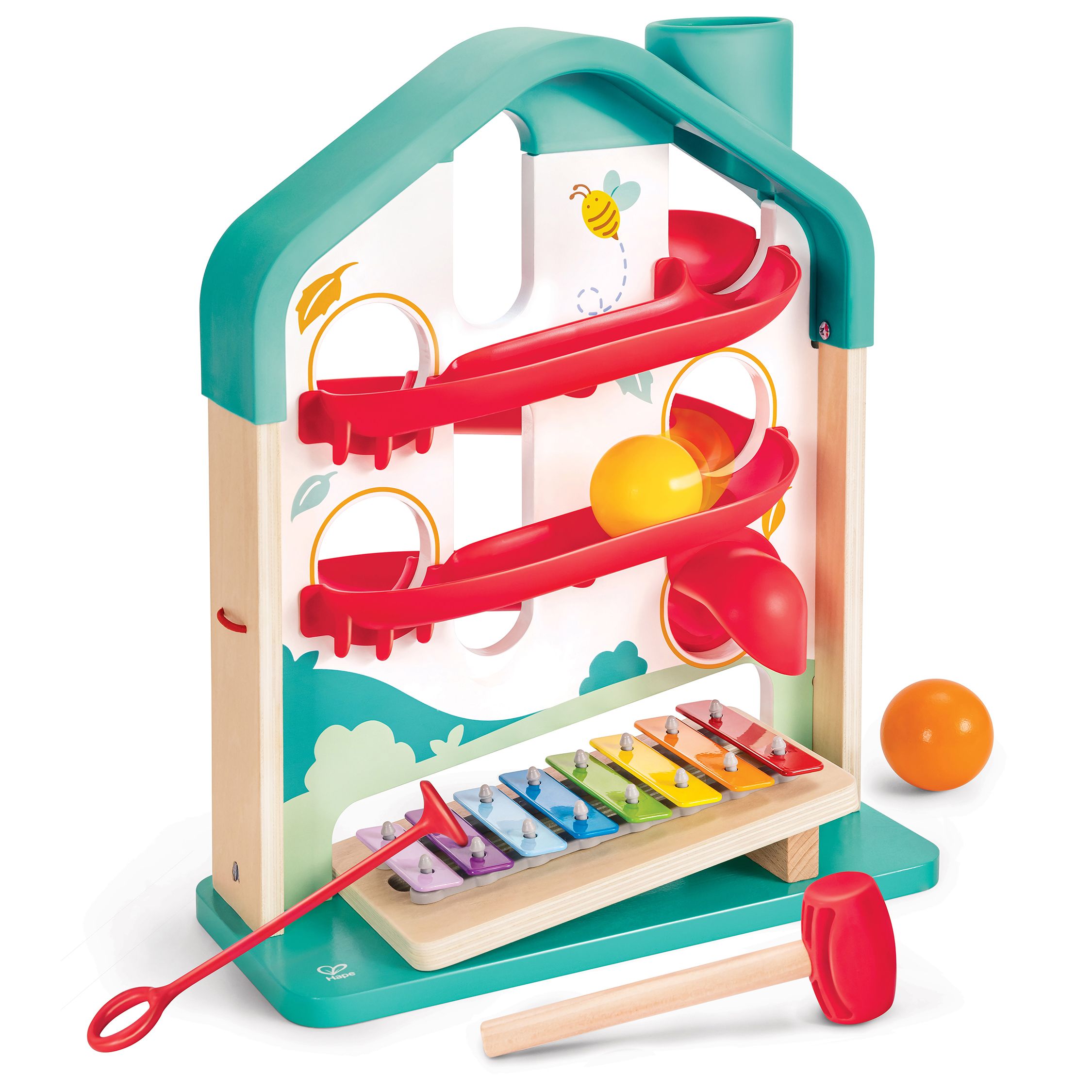 Spingi la palla attraverso il camino della casa e osserva come rotola lungo le piste. Non appena cade sul xilofono arcobaleno, si sentono toni chiari e metallici.