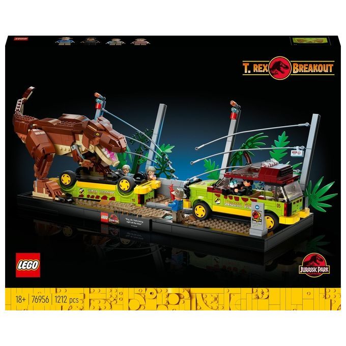 Il set LEGO Jurassic Park comprende un modello snodabile di T.rex che, dopo aver distrutto una recinzione elettrica, capovolge e schiaccia una Ford Explorer ed è pronto ad affrontarne un'altra. Ricrea questa drammatica scena insieme alle minifigure di Alan Grant, Ian Malcolm, Tim Murphy e Lex Murphy, con i dettagli autentici come una torcia, un monitor touch-screen, le impronte del tirannosauro, 2 bicchieri d’acqua, gli occhiali per la visione notturna e molti altri riferimenti alla famosa scena del film.