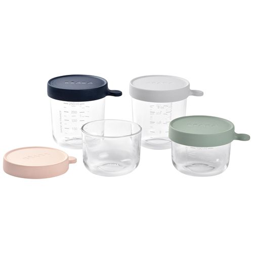 Glas-Portionsbehälter 4er Set, Glas / Kunststoff, Inhalt: 1 x 150 ml Deckel rosa, 1 x 150 ml Deckel grün, 1 x 250 ml Deckel hellgrau, 1 x 250 ml Deckel dunkelblau, 4 m+. Der Deckel ist luftdicht und leicht anzubringen.Technische Details: Name Wert Marke BEABA Farbe rosa / eukalyptus / hellgrau / dunkelblau Materialmix Glas / Polypropylen / SEBS Gewicht 866 g Lieferumfang 2 x 150 ml, 2 x 250 ml
