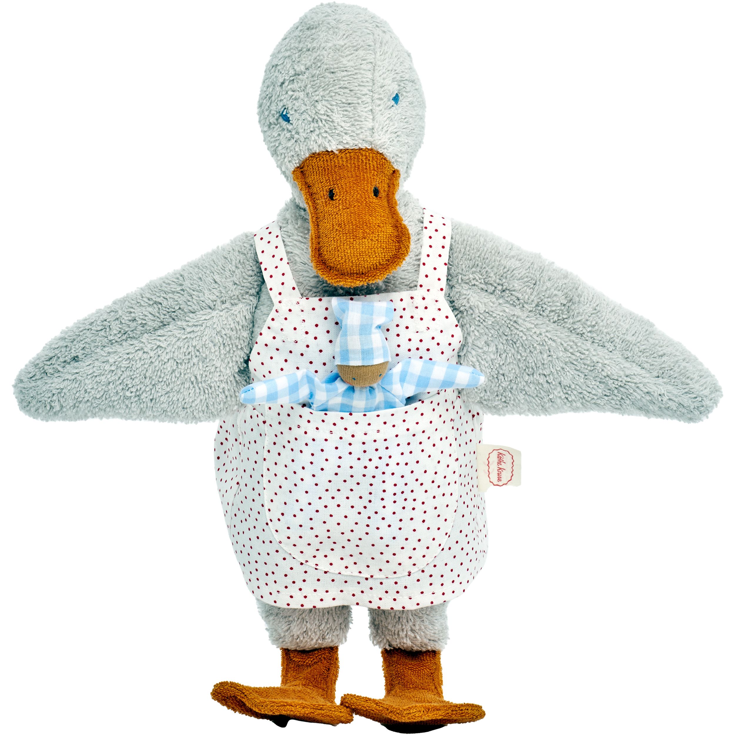 Eva arriva con accessori giocabili: un vestito da grembiule che può essere indossato e tolto e un piccolo pupazzetto di stoffa. Fa parte della famiglia delle anatre Käthe Kruse e fa ridere ogni bambino con i suoi morbidi piedi a papera in cotone tricot.- Da 0 mesi